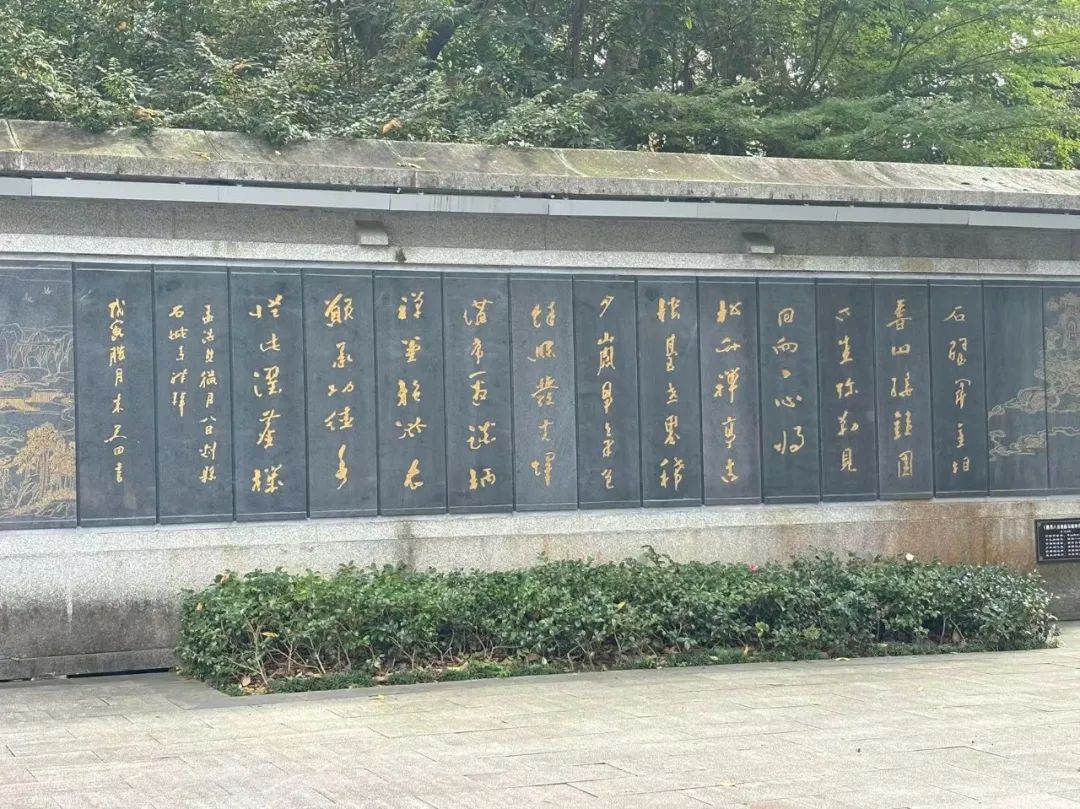 广场前方有照壁,上有书法家朱关田书唐孟浩然《石城题咏·腊月八日于剡县石城寺礼拜》“石壁开金相,香山绕铁围。下生弥勒见,回向一心归。松柏禅庭古,楼台世界稀。夕岚争气色,余照发光辉。讲席邀谈衲,禅堂施浴衣。愿承功德水,从此濯尘机。”