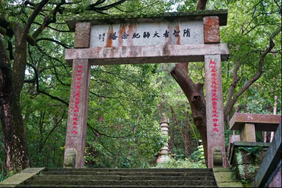 牌坊“石城古刹”四个大字,为著名书法家沙孟海书。两旁的楹联“晋宋开山天台门户,齐梁造像越国敦煌”为陈山撰联,华东师大教授苏局仙老先生所书。