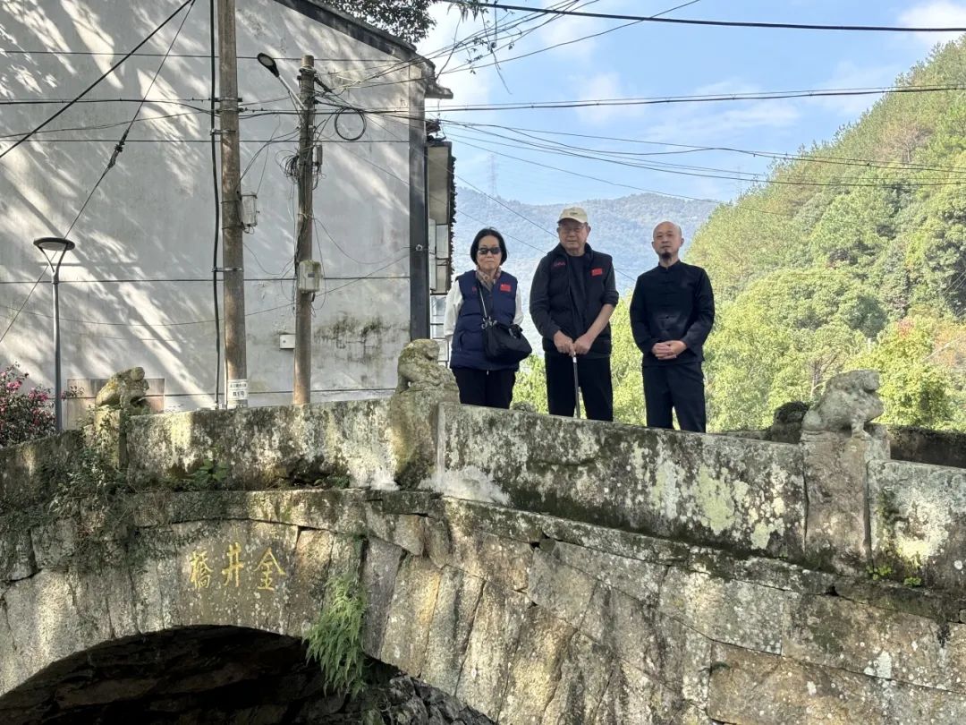 去葛竹古村,会经过斑竹古村,村口有一建于清光绪二十七年(1901)年的金井桥,这是一座单栱石拱桥,桥上有四个石狮子的柱头,憨态可掬,写满沧桑,这是蒋介石携发妻毛福梅前往外婆家的必经之地。
