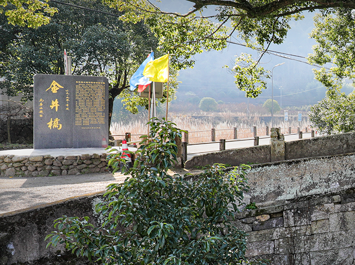去葛竹古村,会经过斑竹古村,村口有一建于清光绪二十七年(1901)年的金井桥,这是一座单栱石拱桥,桥上有四个石狮子的柱头,憨态可掬,写满沧桑,这是蒋介石携发妻毛福梅前往外婆家的必经之地。