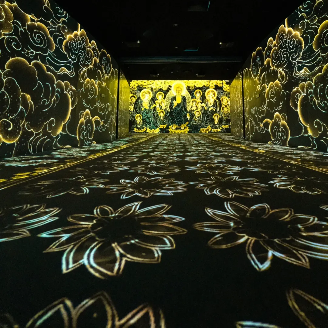 佛像后面是一条以“梦应雪窦,今会龙华”为主题设计的沉浸式光影通道,利用全屏投影技术,在四面墙壁、屋顶和地面上投射出各种动态的影像,随着影像的不断变换,仿佛时光真的在流动。这种佛教元素与现代科技的完美结合,呈现出一种动态的美感。